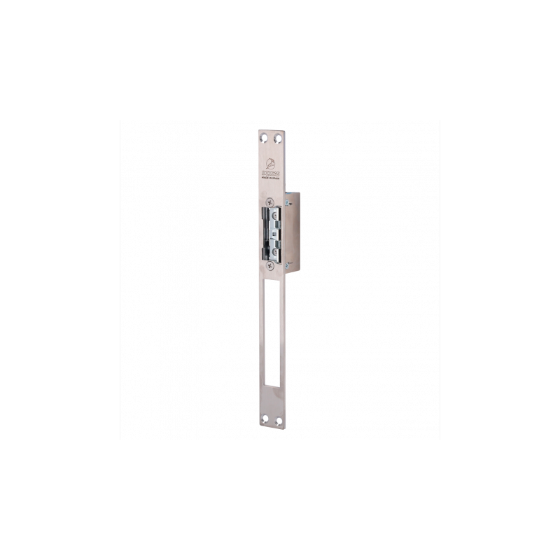 Abrepuertas eléctrico Dorcas, Fail Secure con memoria, retención 330 kg, para puerta sencilla, de 10 a 24 V AC/DC, acero inoxidable.