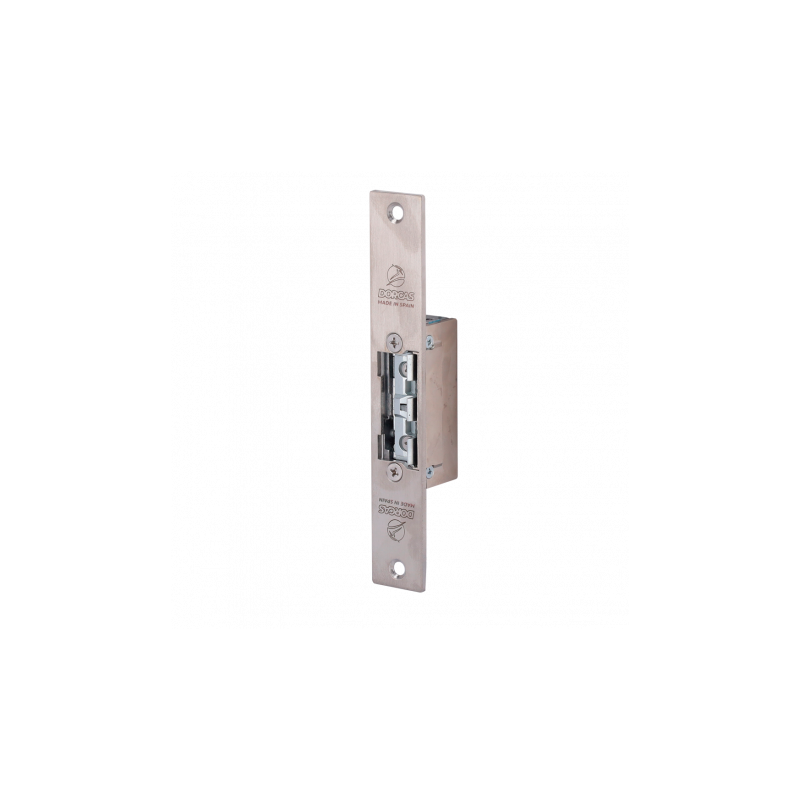 Abrepuertas eléctrico Dorcas, para puerta sencilla, fuerza de retención 330 kg, alimentación AC/DC de 10 a 24 V, acero inoxidable.