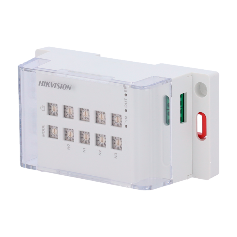 Módulo de relé Hikvision para sistemas de videoportero. Permite añadir una salida de relé adicional con salida NO, NC y COM, diseñado para facilitar la integración en instalaciones de control de acceso o automatización. Alimentado a través del dispositivo DS-KAD706xEY, no requiere fuente adicional, incorpora indicadores de estado y permite montaje en carril DIN o superficie. Compatible como accesorio para placas y monitores de la misma serie.