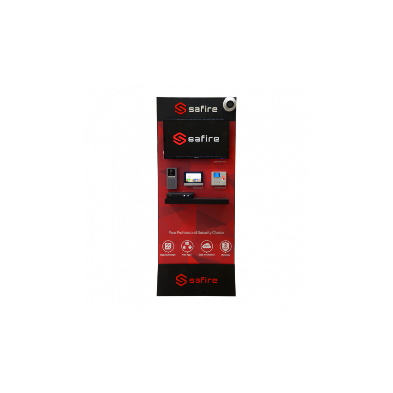 Panel de exposición integral Safire con CCTV 4K, videoporteros, accesos y presencia, switch con conexión a internet, instalación plug and play y stand