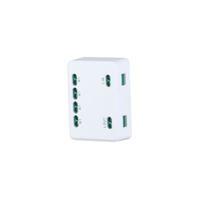 Terminal de ramificación de 1 entrada y 4 salidas para bus de 2 hilos, carcasa PC+ABS, uso en interior, protección CE.