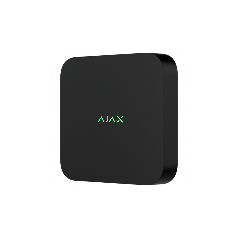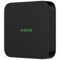 Grabador NVR Ajax de 16 canales, compresión H.265 y H.264, compatible con cámaras hasta resolución 4K a 25 o 30 FPS, ancho de banda de hasta 100 Mbps, espacio para un disco duro de hasta 16 TB. Permite integración con sistemas ONVIF y RTSP, acceso remoto mediante app para smartphone, incluye actualizaciones de firmware OTA en remoto, diseño en color negro.