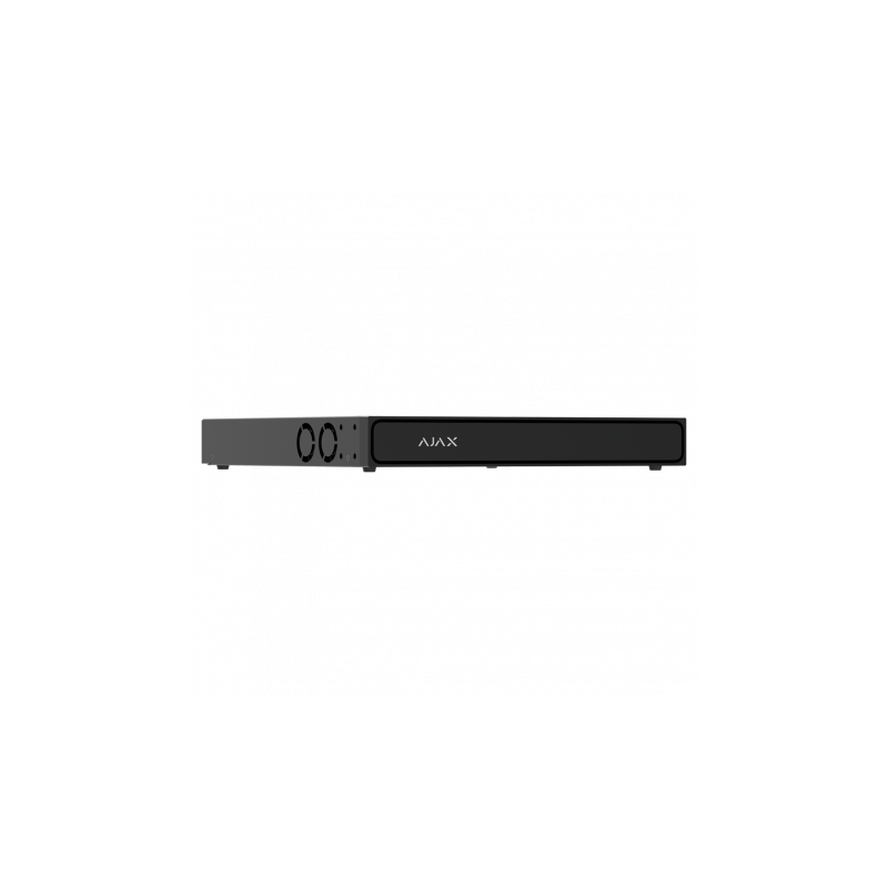 Grabador NVR PoE de 8 canales, admite cámaras ONVIF y RTSP, resolución hasta 12 megapíxeles, compresión H.265 y H.264, JetSparrow, ancho de banda de hasta 160 Mbps, ocho puertos PoE RJ45 Ethernet rápido, salida HDMI hasta 3840 × 2160, protección IP20, compatible con la app Ajax, espacio para dos discos duros de hasta 16 TB, opciones de grabación programada y por detección de movimiento, detección de objetos por inteligencia artificial, alimentación AC de 110 a 240 V, dimensiones de 330 por 330 por 44 mm, color negro.