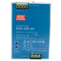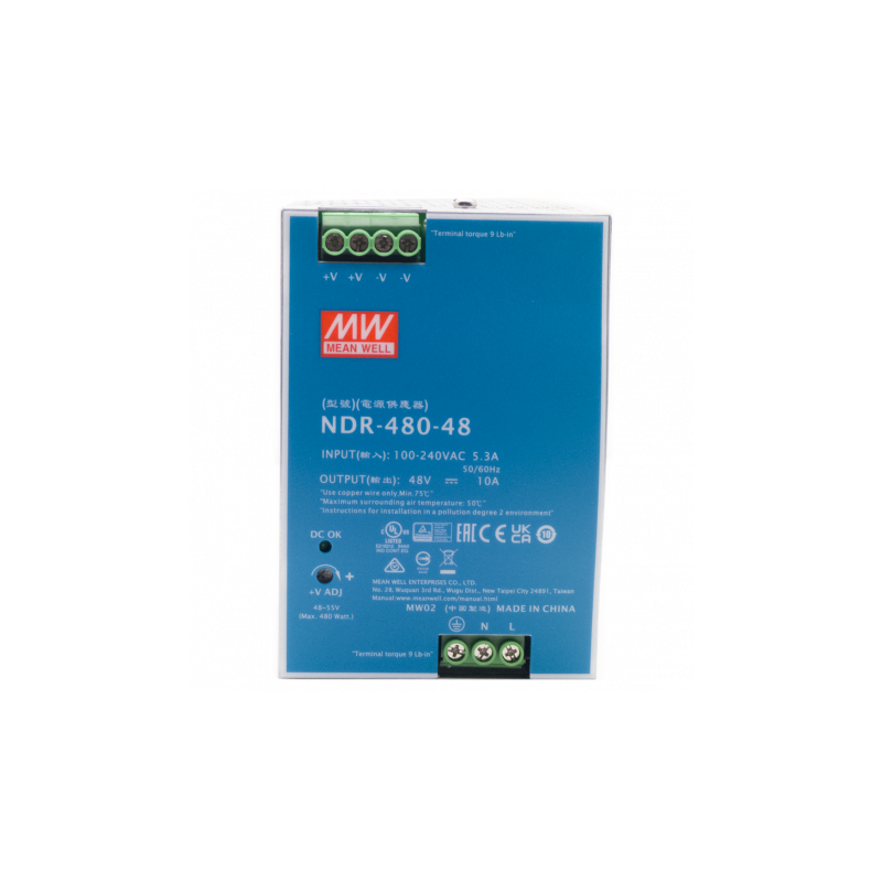 Fuente de alimentación industrial para montaje en carril DIN, salida DC de 48 V y 10 A con potencia máxima de 480 W, equipada con dos salidas DC, rango de entrada de AC de 100 a 240 V, dimensiones compactas de 63 mm x 125,2 mm x 113,5 mm, eficiencia del 92,5 por ciento, rango de voltaje ajustable, carcasa robusta, ideal para aplicaciones industriales que requieren estabilidad y alto rendimiento en la alimentación eléctrica.