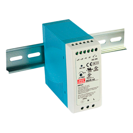 Fuente de alimentación conmutada con formato para montar sobre carril din, rango de entrada universal de 85 a 264 VCA, 47 a 63 Hz, tensión de salida de 12 VCC ajustable con potenciómetro a 12-15 VCC, intensidad de salida de 3,33 A, rango de corriente de salida de 0 a 3,33 A según demande la carga, potencia de 40 W, eficiencia del 86%, clase de entrada I con toma de tierra, consumo sin carga inferior a 0,75 W, aislamiento entrada-salida de 3000 VCA, ruido y rizado de 120 mVp-p. Temperatura de trabajo desde -20 hasta +70ºC, dimensiones de 40 x 90 x 100 mm. Incluye 3 años de garantía, fabricante MEAN WELL y certificados CE, BSMI, EAC, RCM, TÜV, UKCA y UL.