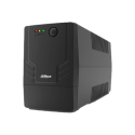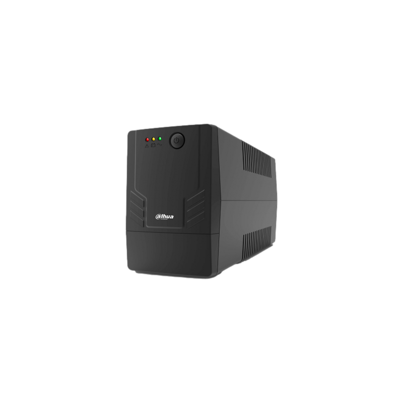 UPS línea interactiva Dahua de 1000 VA y 600 W, entrada de AC de 170 a 280 V con estabilización digital, batería interna de 9 Ah recargable en 4 a 6 horas, protección contra sobrecarga, cortocircuito y sobredescarga de batería, dos salidas Schuko europeas, diseño compacto y silencioso.