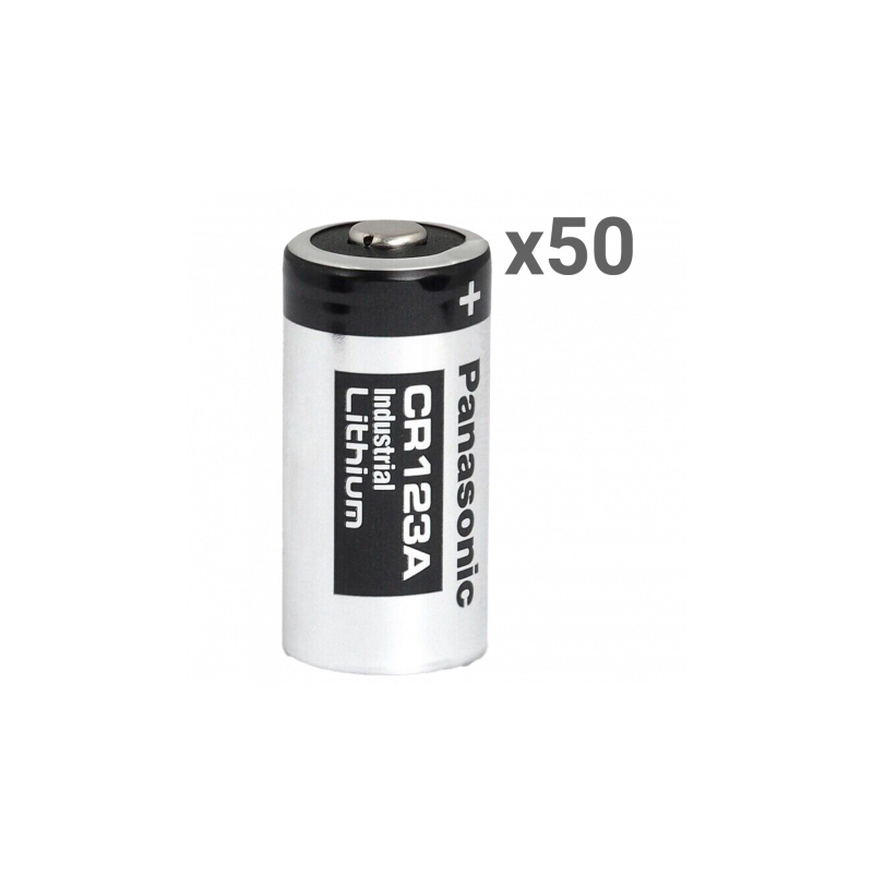 Pila de litio Panasonic CR123A, pack de 50 unidades, voltaje 3.0 V, capacidad 1550 mAh, formato cilíndrico, no recargable.