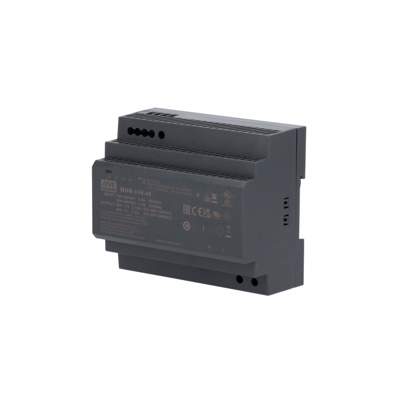 Fuente de alimentación industrial para montaje en carril DIN, salida DC 48 V, 3,2 A, potencia máxima de 150 W, dos salidas independientes, rango de voltaje ajustable de 43,2 a 55,2 V, dimensiones de 178 ancho, 97 alto, 38 fondo milímetros, protección contra sobrecarga y cortocircuito, ligera y compacta, adecuada para distintas aplicaciones eléctricas.