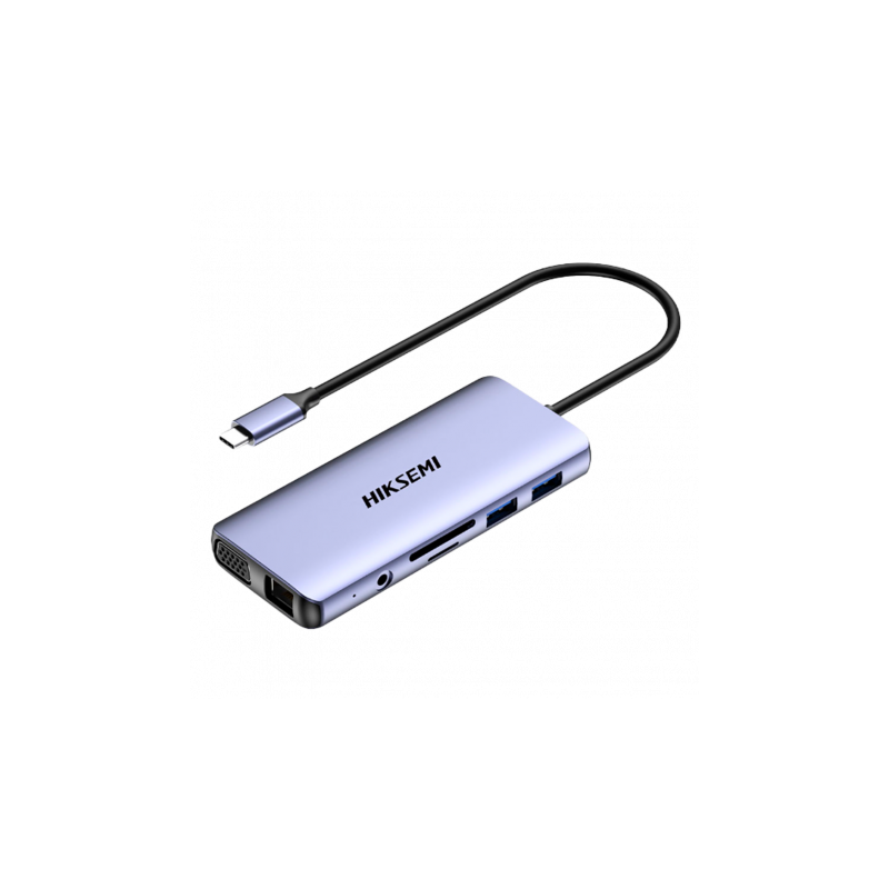 Hub USB-C 11 en 1 Hikvision, admite carga PD de 100 W, transferencia de datos de hasta 5 Gbps, conectado mediante USB-C compatible con 2 puertos USB A 3.0, 2 puertos USB A 2.0, puerto USB C adicional, salida HDMI 4K y VGA, entrada de audio jack 3.5, puerto ethernet, incorpora lector de tarjetas microSD y SD, solución compacta para conectar múltiples dispositivos y periféricos desde un solo puerto.