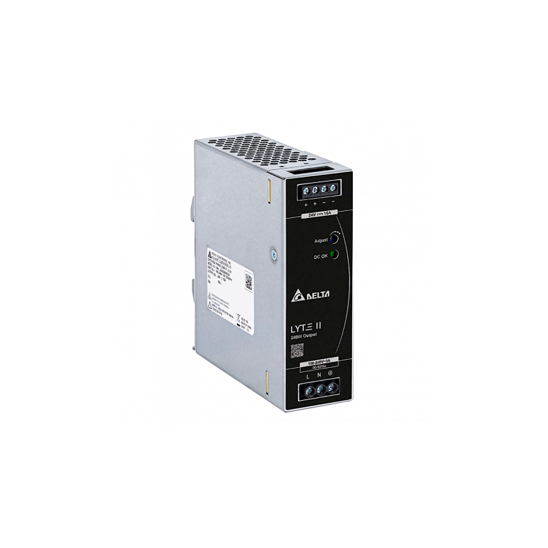Fuente de alimentación conmutada, salida DC 48 V, corriente de 5 A, potencia de 240 W, diseñada para montaje en carril DIN, rango de tensión de salida de 43,2 a 52,8 VDC, eficiencia a plena carga del 90,5%, compatible con entrada AC de 90 a 264 V, frecuencia de entrada de 50 a 60 Hz, dimensiones compactas, peso de 620 gramos, adecuada para ambientes con humedad de 5 a 95%, soporta temperaturas de almacenamiento de -40 ºC a +85 ºC, cableado de entrada AWG 18 a 12, cableado de salida AWG 22 a 12, ondulación y ruido menores a 240 mVpp desde 0 ºC a +70 ºC y menores a 480 mVpp desde -30 ºC a 0 ºC, tiempo de espera de 20 ms a 115 VCA y 230 VCA con carga completa.