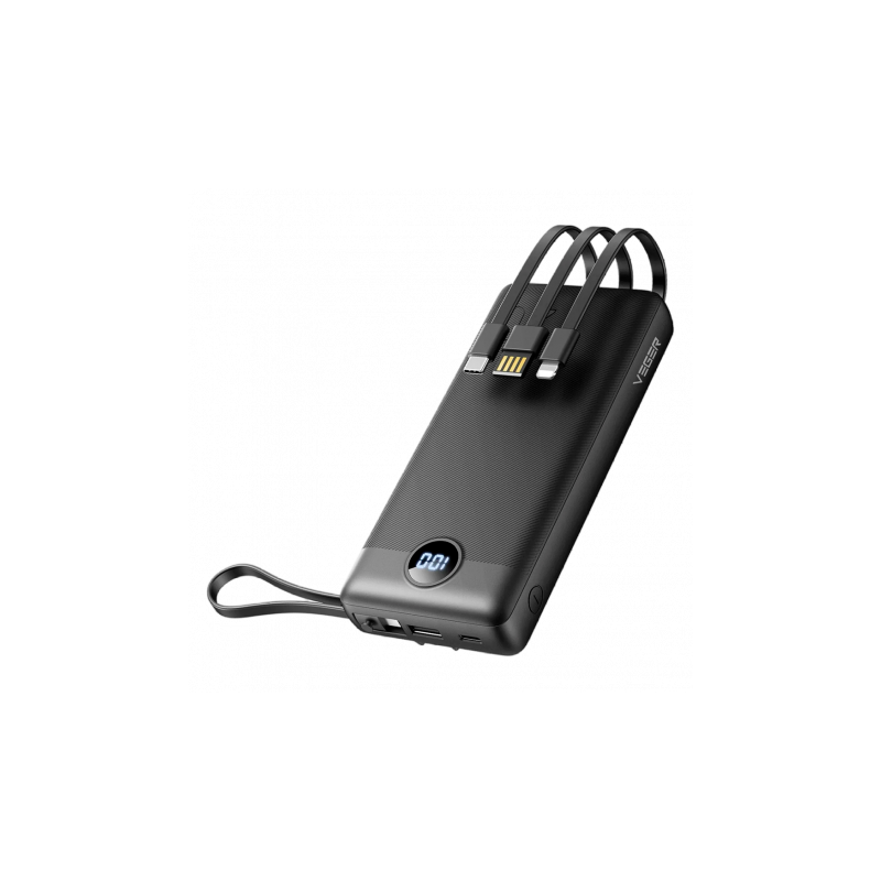Power Bank Veger portátil, capacidad de 20000 mAh, color negro. Incorpora pantalla LCD, permite cargar hasta 3 dispositivos a la vez. Incluye cables integrados USB-C, Micro USB-C y 8pin, puerto USB-A y USB-C como entradas y salidas, tecnología Power IQ, batería de polímero de litio y diseño compacto.