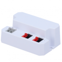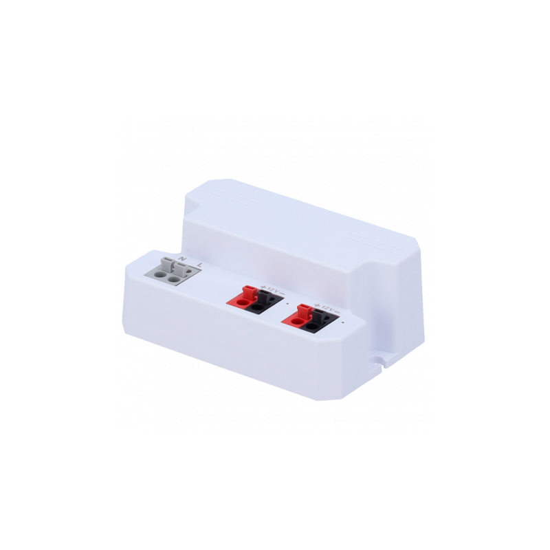 Fuente de alimentación conmutada, entrada AC de 100 a 240 V, salida doble canal, suministra DC 12 V a 2 A con una potencia total de 24 W, acabado en color blanco, dimensiones compactas para integración en diferentes espacios.