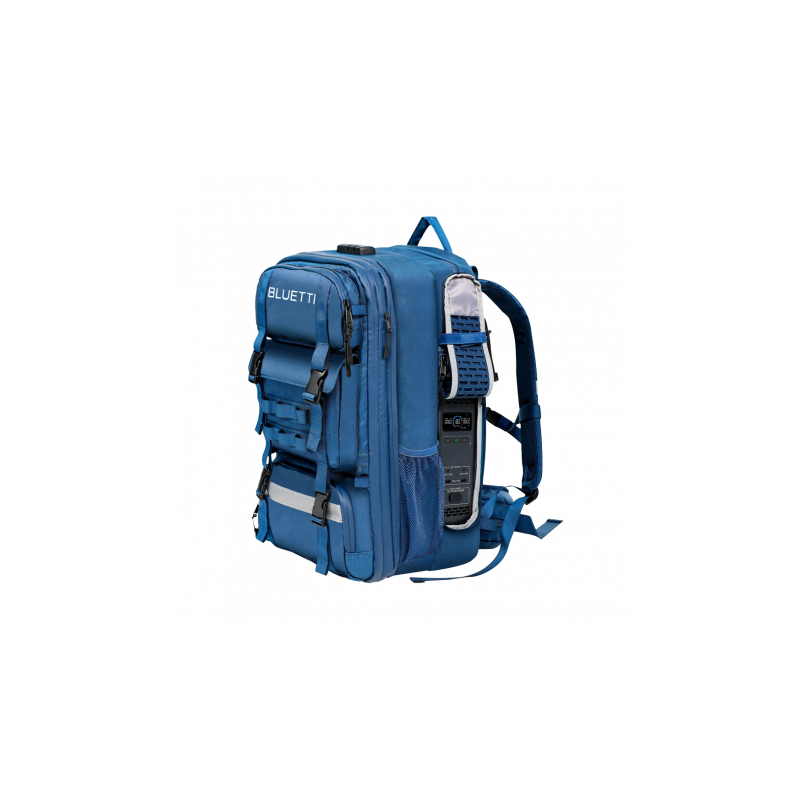Estación de energía portátil integrable en mochila de 42 litros, capacidad de 268 Wh, potencia máxima de salida 300 W, con múltiples salidas y modos de recarga, vida útil de 4000 ciclos, permite control mediante aplicación. Integra batería de litio de perfil bajo, desmontable, compatible con recarga solar, con sistema de distribución de peso, resistencia al agua IPX4, cremalleras impermeables, funda para lluvia, compartimentos modulares y apertura lateral de acceso rápido a puertos. Ideal para actividades al aire libre, trabajo remoto, viajes largos o situaciones de emergencia.