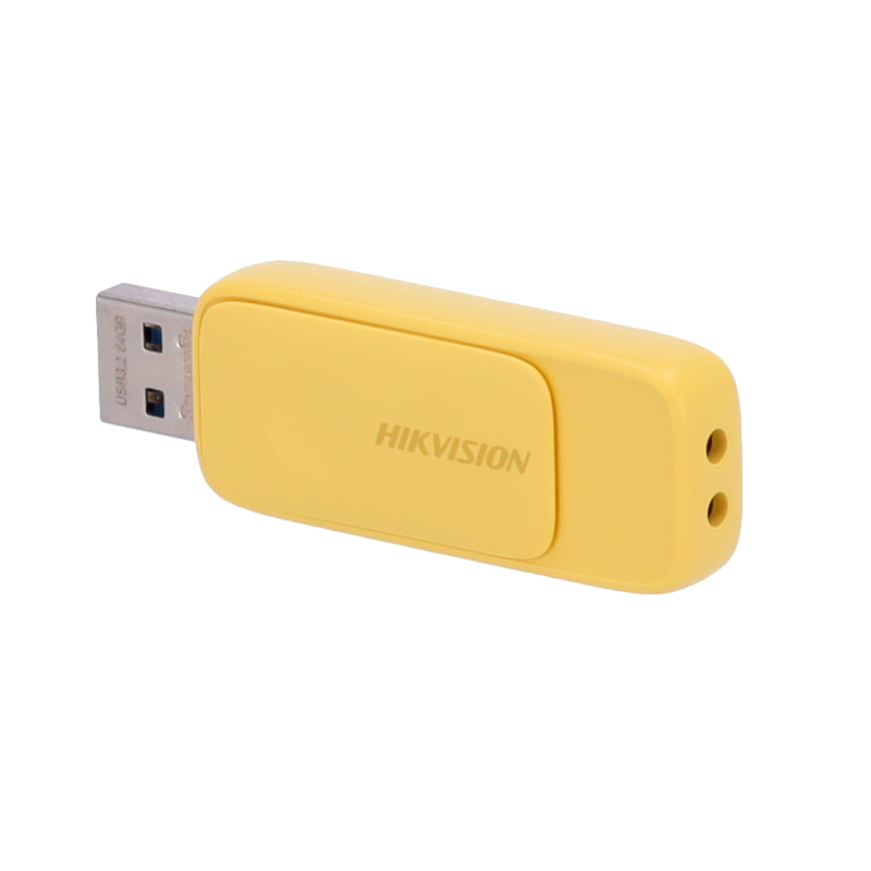 Pendrive USB Hikvision. Capacidad 64 GB, Interfaz USB 3.2, Velocidad máxima de lectura 120 MB/s, Velocidad máxima de escritura 45 MB/s, Diseño compacto en color amarillo.