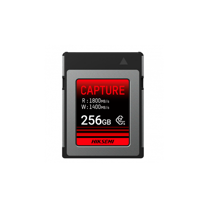 Tarjeta CFExpress Tipo B Hikvision con capacidad de 256 GB, diseñada para fotografía profesional, permite almacenar imágenes y vídeos en resolución hasta 8K, incorpora tecnología NAND 3D TLC, conector PCIe Gen 3 x 2, velocidad de lectura de hasta 1800 megabytes por segundo y velocidad de escritura de hasta 1400 megabytes por segundo, soporta hasta 3.000 ciclos de lectura y escritura, proporciona alta durabilidad para un uso intensivo en cámaras y dispositivos avanzados.