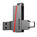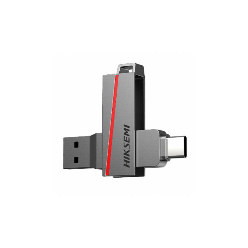 Pendrive USB Hikvision 256 GB, interfaz USB Tipo A y Tipo C 3.2, carcasa metálica, velocidad de lectura 130 MB/s, diseño compacto.