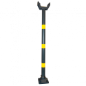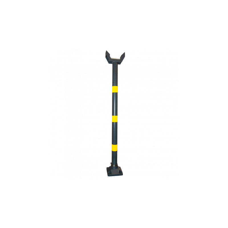 Soporte vertical para brazo de barrera diseñado para barreras de parking, compatible con cualquier tipo de barrera, imprescindible para brazos de 6 metros, altura regulable de 78 a 98 centímetros, fabricado en aluminio, acabado en color gris con bandas reflectantes para mayor visibilidad.