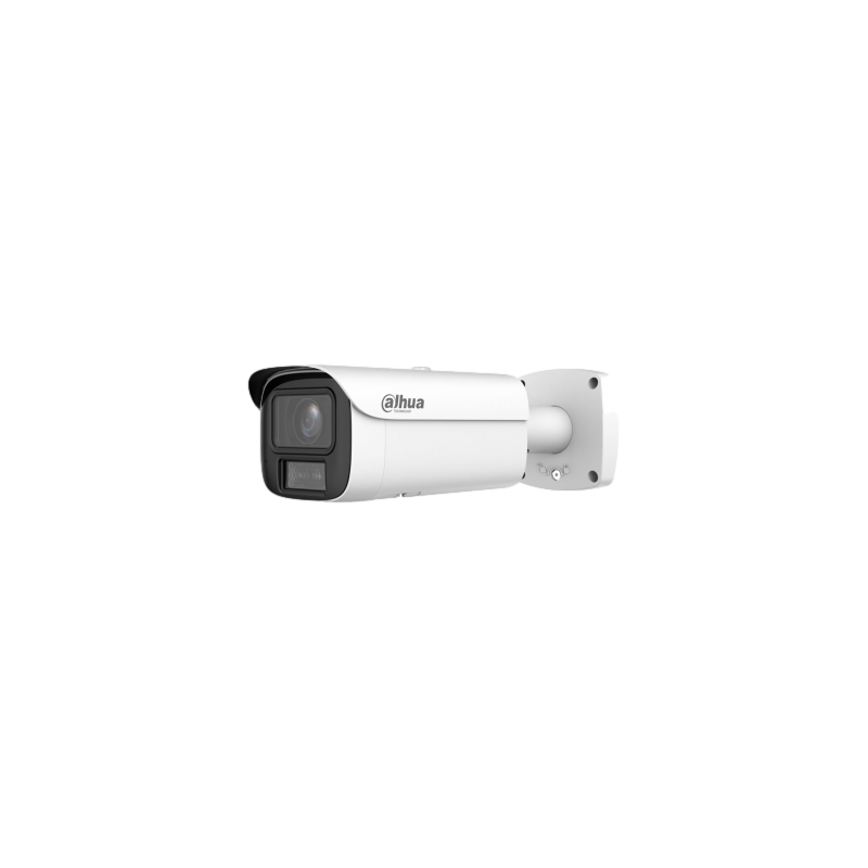 Cámara IP tipo bullet Smart Dual Light Dahua Serie WizMind 5, resolución de 8 megapíxeles a 25 o 30 ips, sensor CMOS de 1/1.8 pulgadas con filtro ICR, sensibilidad de 0,0008 lux, doble iluminación IR y luz cálida con alcance de hasta 60 metros, óptica motorizada varifocal de 2,7 a 12 mm, amplio rango dinámico WDR de 120 dB, compresión avanzada con IA, funciones analíticas AcuPick, SMD 4.0, protección perimetral, reconocimiento facial, conteo de personas, mapa de calor, audio bidireccional y alarmas, resistente a exteriores con clasificación IP67, resistente a impactos IK10, alimentación por PoE y ePoE.
