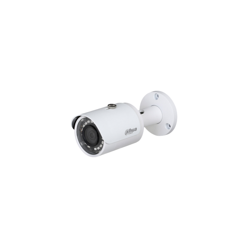 Cámara IP bullet Dahua Lite Series, imagen de 4 megapíxeles a 20 imágenes por segundo y 3 megapíxeles a 25 o 30 imágenes por segundo, compresión Smart H.265+ y H.264+, iluminación infrarroja de hasta 30 metros, óptica fija de 2,8 mm, WDR 120 dB y reducción de ruido 3D NR, análisis de vídeo inteligente con detección de intrusión y cruce de línea, conectividad RJ45 10/100, protección IP67, alimentación de 12 V CC y PoE.
