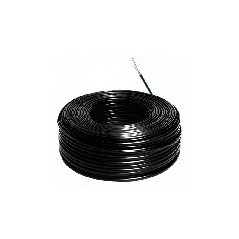 Cable UTP categoría 6 para exterior, conductor de cobre OFC con pureza del 99,9 por ciento, cubierta exterior tipo PE, presentado en bobina de 305 metros. Diseñado para instalaciones en exteriores, soporta tracción y compresión, ofrece conexiones estables, cumple los estándares internacionales ANSI TIA 568.2 D, ISO IEC 11801 e IEC 61156. Diámetro del conductor de 0,45 mm, compatible con alimentación PoE hasta 57 V y 1 A, adecuado para enlaces de hasta 90 metros en instalación permanente y 100 metros en canal completo con temperaturas de hasta 50 grados Celsius.