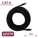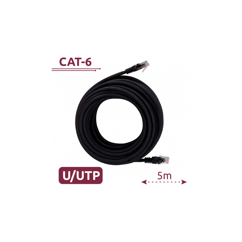 Cable UTP de 5 metros, categoría 6, diseñado para redes Ethernet, con conectores RJ45 en ambos extremos, recubierto con PVC resistente, color negro, aporta una transmisión estable y eficiente para aplicaciones de datos, dispositivos de red y sistemas de cableado estructurado.