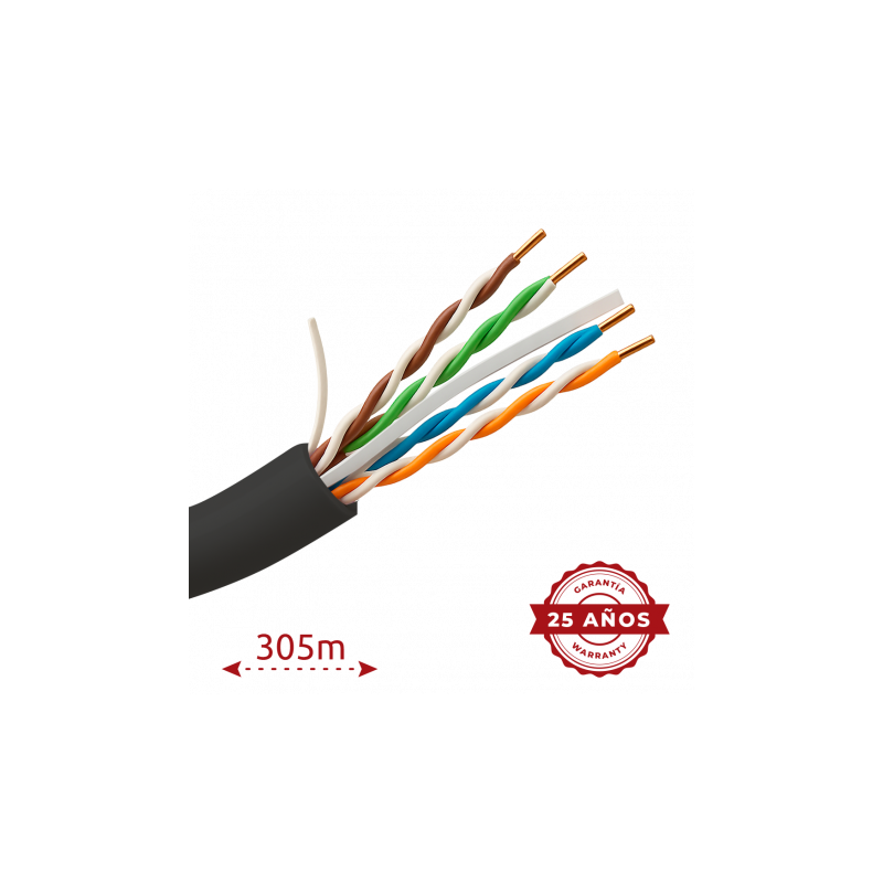 Cable UTP rígido diseñado para instalaciones en exteriores, categoría 6, compatible con hasta 90 metros Fluke test. Conductor OFC, pureza de cobre del 99,9 por ciento, rollo de 305 metros, diámetro de 5,5 milímetros. Aislamiento HDPE, cubierta exterior en polietileno de color negro, resistencia de aislamiento de hasta 95 ohmios por kilómetro, presentado en caja de cartón.