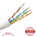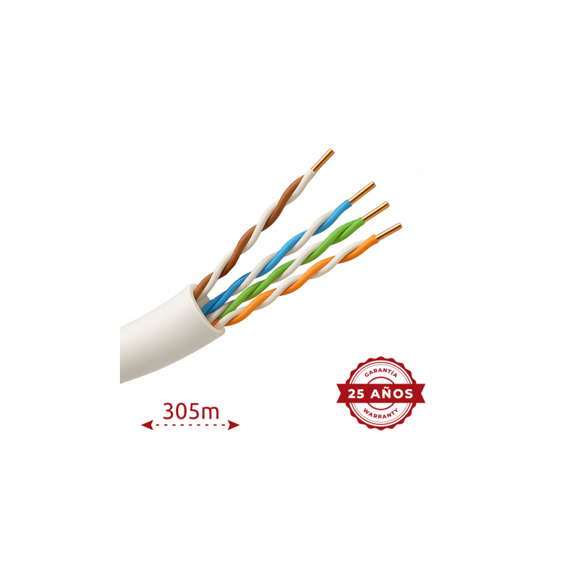 Cable UTP rígido para exterior, categoría 5e, cumple con prueba Fluke hasta 90 metros, conductor OFC con pureza del 99,9 por ciento de cobre, presentado en rollo de 305 metros, diámetro exterior de 5,5 milímetros, proporciona conectividad estable para instalaciones en exteriores, aislamiento de HDPE y cubierta exterior de PE, color blanco.