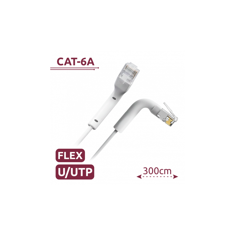 Cable UTP flexible categoría 6A, 3 metros, conectores RJ45, cubierta TPE, color blanco, ideal para redes profesionales.