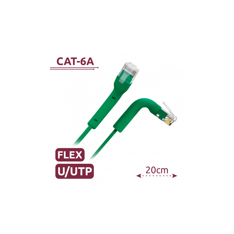 Cable UTP flexible de 0,2 metros, categoría 6A, conectores RJ45, color verde, cubierta TPE, ideal para racks de alta densidad.