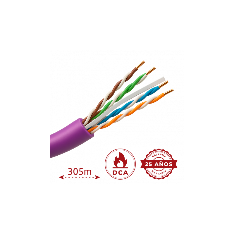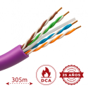 Cable UTP categoría 6, 305 metros, conductor rígido cobre 24AWG, LSZH morado, diámetro 5 mm, cumple 90 metros Fluke test.
