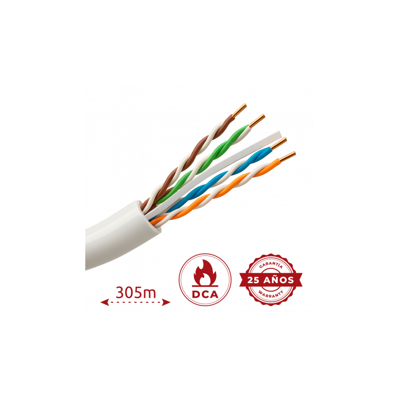 Cable UTP rígido libre de halógenos, categoría 6, rollo de 305 metros, conductor OFC con pureza de 99,9 por ciento cobre, cumple con el test Fluke para 90 metros. Diámetro exterior de 5,5 milímetros, color gris. Retardante al fuego y baja emisión de humos según IEC 60332-1, con cubierta exterior LSZH, nivel de seguridad Dca-S1, d2, a1. Certificación ISO/IEC11801, TIA-568-C.2, YD/T1019.