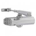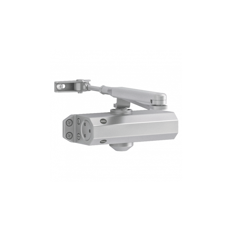 Cierrapuertas de brazo articulado de instalación superficial y reversible, diseñado para puertas con peso máximo de 120 kg y hasta 1400 mm de anchura, permite apertura convencional de hasta 180 grados y cuenta con doble velocidad ajustable, compatible con todo tipo de puertas, incluidas puertas RF. Construido en metal color plata, soporta más de un millón de ciclos de uso.