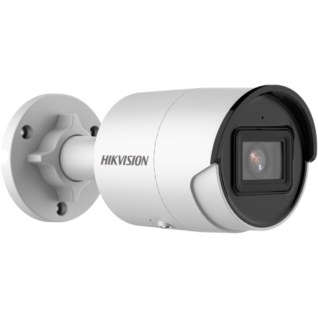 Cámara IP Bullet Hikvision. 6MP@25fps, H265+. Sensor de 1/2,4 pulgada, 0,00 lux, Smart IR 40 metros. Lente fija 2,8 mm. WDR 120dB, Starlight. Protección perimetral, detección facial. 1 entrada/1 salida de audio. Micrófono incorporado, alarma, IP67.