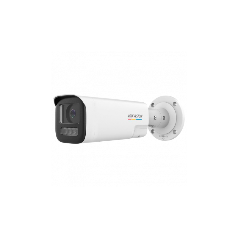 Cámara IP Bullet Hikvision gama VALUE ColorVu 3.0, resolución de 4 megapíxeles, PoE IEEE802.3af, captura imagen a color con tecnología ColorVu 3.0, lente de 2.8 mm, sensor F1.0 1/1.8", incorpora micrófono, luz híbrida con alcance de hasta 50 metros, detección de movimiento 3.0 con clasificación de personas y vehículos, altavoz y luz estroboscópica azul y roja, grado de protección IP67, ranura para tarjeta microSD de hasta 512 GB.