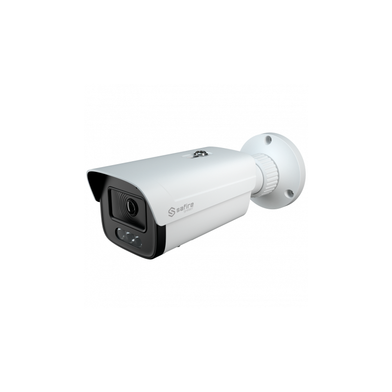 Safire Smart cámara Bullet IP de la gama I1 equipada con sensor de imagen de 1/1,8 pulgadas, apertura F1.0, tecnología Night Color X, que ofrece visión a color en completa oscuridad sin iluminación adicional. Resolución de 8 megapíxeles, grabación 3840x2160, lente fija de 2,8 mm, ángulo de visión amplio, micrófono integrado y almacenamiento MicroSD hasta 1TB. Incluye LED blanco con alcance de 30 metros, protección impermeable IP67 y alimentación PoE IEEE802.3af. Inteligencia artificial avanzada para clasificación precisa de humanos y vehículos, generación de metadatos, captura facial y conteo, para una vigilancia eficiente con reducción de falsas alarmas.