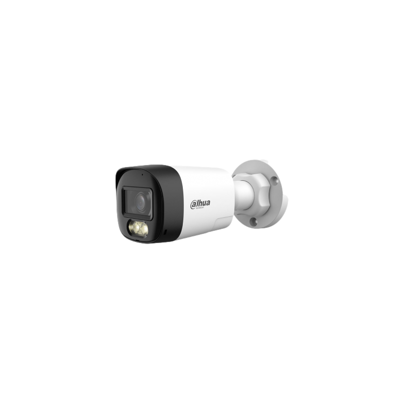 Cámara bullet Dahua Lite Series 4 en 1, con tecnología Smart Dual Light, Smart Light+ y audio bidireccional. Sensor CMOS de 2 megapíxeles, vídeo 1080P a 25 imágenes por segundo, ICR automático, iluminación mínima de 0,01 lux en color y 0,001 lux en blanco y negro, visión nocturna IR hasta 30 metros, luz blanca hasta 30 metros, óptica fija de 2,8 mm, campo de visión horizontal 111,3°, funciones 3DNR, DWDR, BLC, HLC, detección de movimiento, enmascaramiento de privacidad. Micrófono y altavoz integrados con audio bidireccional y transmisión por coaxial hasta 8 metros. Formatos de salida CVI, TVI, AHD y CVBS conmutables por DIP. Protección IP67, alimentación de 12V CC.