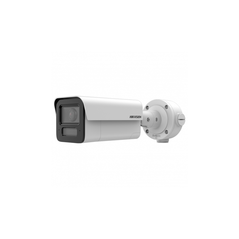 Cámara Bullet IP Hikvision, resolución 4 MP, lente fija 2.8 mm, luz híbrida hasta 80 metros, audio, PoE+, protección IP67, IK10.