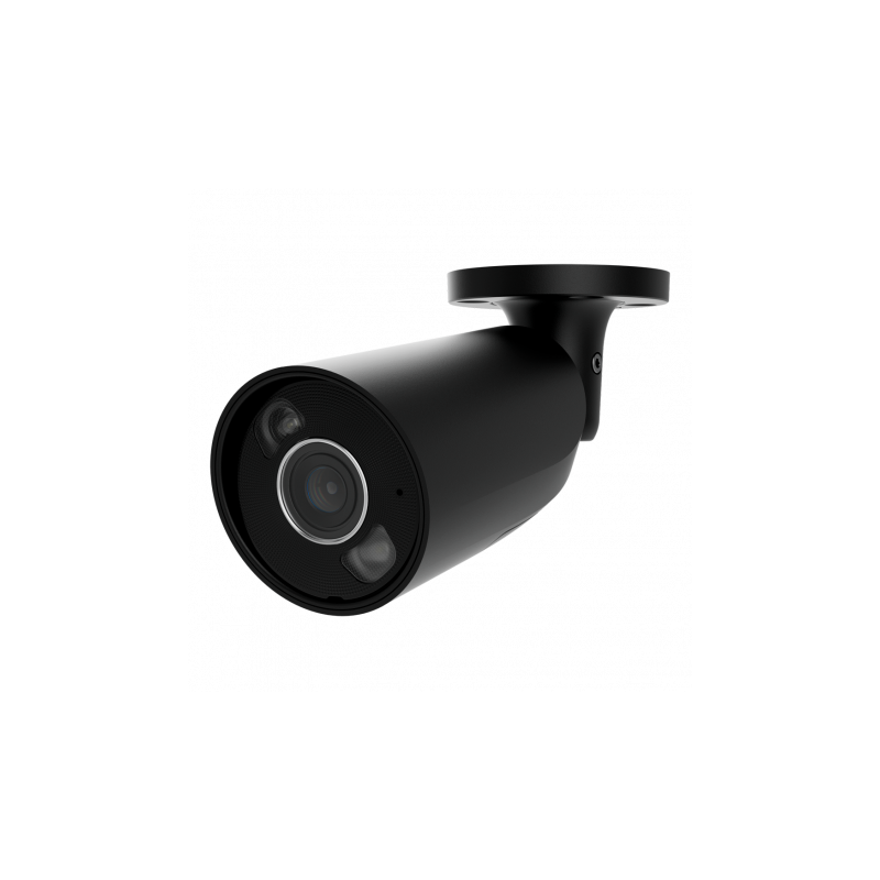 Cámara IP Bullet 8 MP, lente fija 4 mm, visión nocturna IR y luz blanca hasta 50 metros, PoE, IP65, micrófono, color negro.