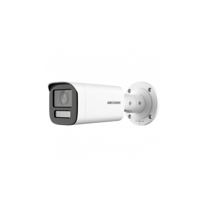 Cámara Bullet Hikvision HDTVI de la gama Value con sensor CMOS de alto rendimiento, resolución de 2 megapíxeles 1920x1080, salida de vídeo HDTVI, lente motorizada varifocal de 2.8 a 12 mm, ángulo de visión de 106 a 32 grados y visión infrarroja con alcance de hasta 60 metros, iluminación mínima de 0.0005 lux F1.28, incorpora micrófono integrado para audio ambiente, permite detección de movimiento, dispone de filtro IR CUT, tecnología WDR 130dB y 3D DNR para claridad de imagen, protección impermeable IP67 para exteriores, estructura de metal, tres ejes de ajuste, alimentación de 12 VDC, incluye accesorios de instalación y plantilla.