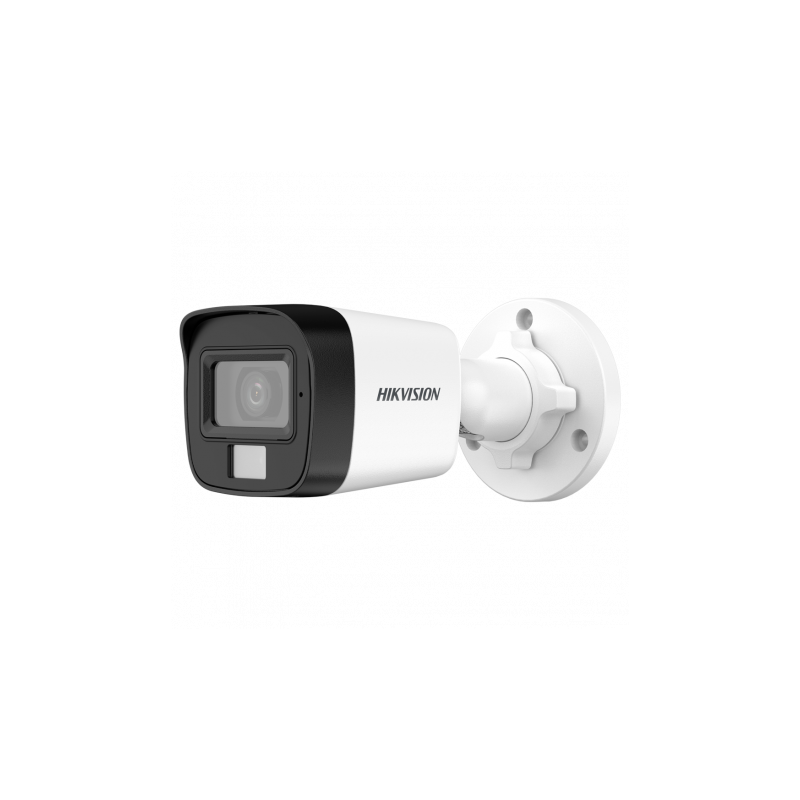 Cámara Bullet Hikvision 4 en 1, resolución 2K, lente de 2.8 mm, IR hasta 25 metros, luz blanca 20 metros, IP67, micrófono integrado.