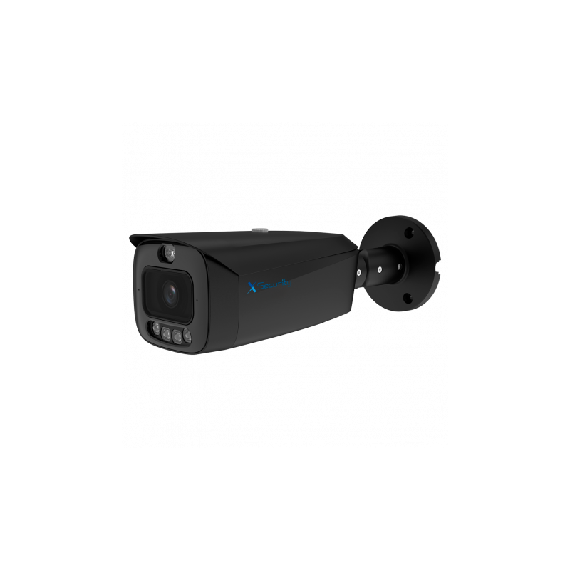 Cámara Bullet IP X-Security de 4 megapíxeles, sensor CMOS de 1/1,8 pulgadas, lente fija de 2,8 mm, visión Full-Color y tecnología Wizcolor para imágenes a color real las 24 horas, incluso en condiciones de baja iluminación, iluminación mínima de 0,0005 lux F1.0 en color y 0,0004 lux F1.0 en blanco y negro, 0 lux con IR activado, alcance de IR y luz blanca de 50 metros, micrófono integrado, funciones inteligentes de protección perimetral, búsqueda inteligente y clasificación avanzada de vehículos y personas, rango dinámico amplio de 120 dB, tecnología 3D DNR, compresión H.265, ranura MicroSD de hasta 512 GB, protección IP67, construcción en metal y plástico, color negro.