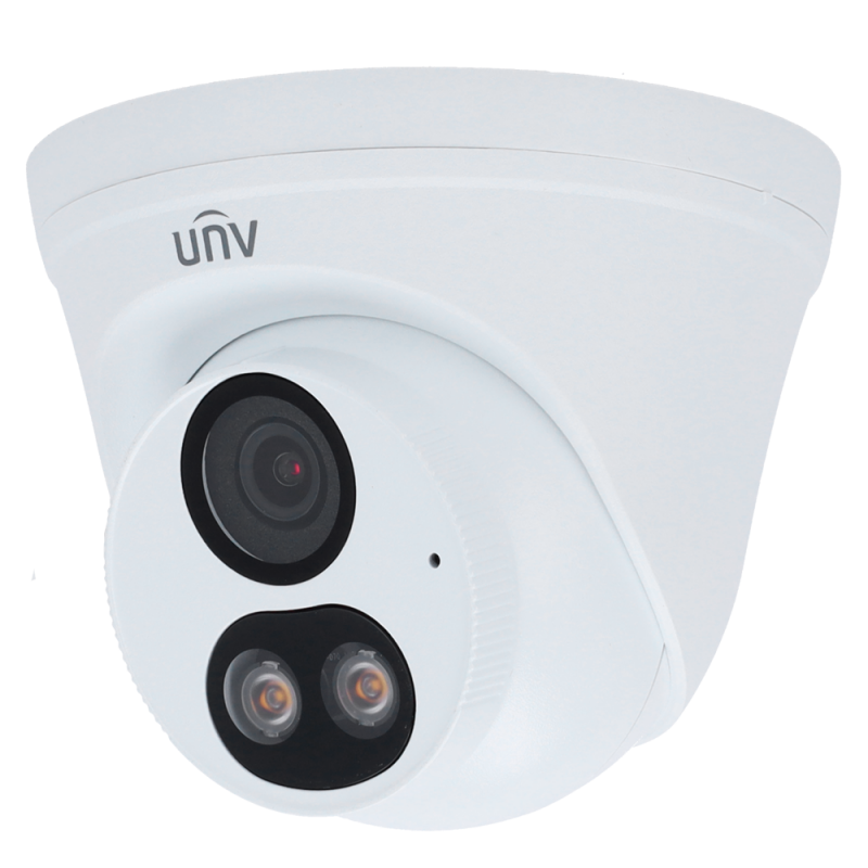 Cámara IP tipo turret de 2 megapíxeles, lente fija 2.8 mm, Color Hunter para imágenes a color en baja luminosidad, luz blanca con alcance 30 metros, micrófono integrado, compresión Ultra265 H.265 H.264, PoE, ranura microSD hasta 128 GB, IP67, ONVIF.