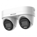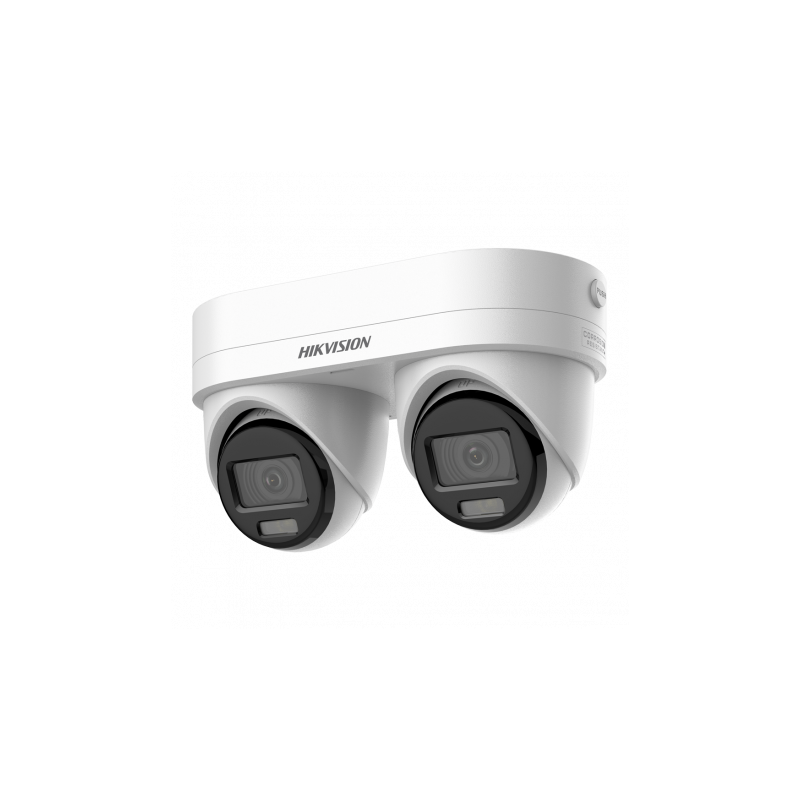 Cámara Turret IP de la gama PRO de Hikvision, resolución de 4 megapíxeles, doble canal, ofrece imágenes de alta definición de 2688x1520, lente de 2.8 o 4 mm en una sola cámara, iluminación infrarroja inteligente hasta 30 metros, detección de movimiento avanzada y tecnología AcuSense 3.0 para reducción de falsas alarmas en cruce de línea, intrusión en área, región de entrada y salida, incorpora luz roja y azul disuasoria y luz blanca, incluye micrófono y altavoz integrados, alimentación PoE+, protección impermeable IP67 y anticorrosiva NEMA 4X.