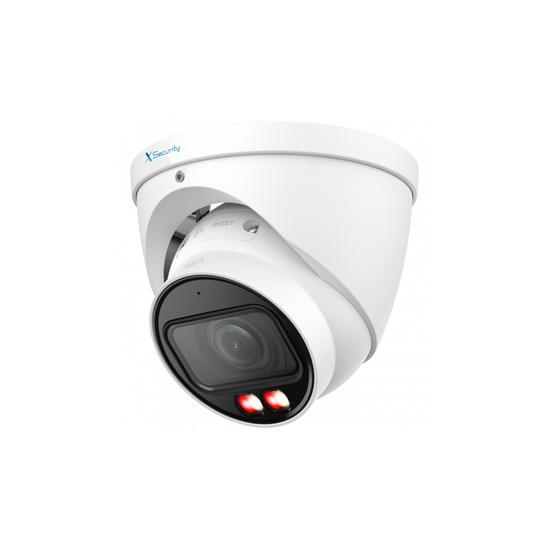 Cámara IP Turret X-Security de 8 megapíxeles, resolución de 3840x2160, lente varifocal motorizada de 2.7 a 13.5 mm, WDR 120 dB, Dual Light con alcance de 40 metros, incorpora la tecnología WizSense con clasificación de humano y vehículo, ranura MicroSD, protección IP67, alimentación PoE y funciones SMD Plus.