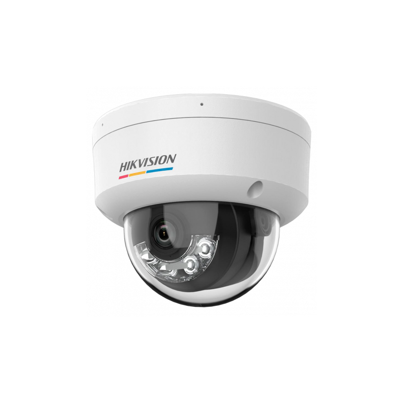 Cámara IP Domo Hikvision gama Value ColorVu 3.0 de 4 megapíxeles, PoE IEEE802.3af, imagen a color las 24 horas con HikAI-ISP y superapertura F1.0, sensor CMOS de 1/1,8 pulgadas, lente fija de 2,8 mm, micrófono integrado, luz híbrida infrarroja y luz blanca con alcance de hasta 30 metros, clasificación de humano y vehículo gracias a Motion Detection 3.0, protección IP67 y nivel antivandálico IK08, ranura para tarjeta microSD de hasta 512GB.