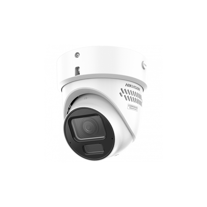 Cámara IP Turret Hikvision PRO, resolución 4 MP, lente motorizada 2.8 a 12 mm, ColorVu3.0, luz híbrida 40 metros, IP67, IK10, PoE+.