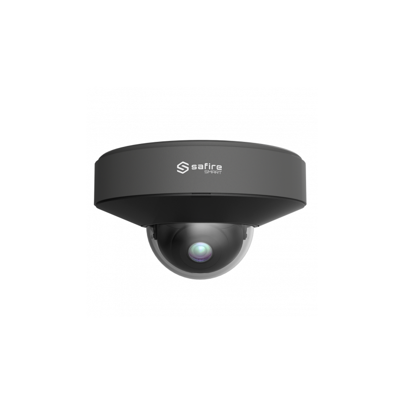 Cámara domo IP Safire Smart de la gama I1, equipada con inteligencia artificial avanzada, 4 megapíxeles de resolución (2592x1520), lente fija de 2,8 mm, micrófono integrado, visión nocturna con iluminación infrarroja hasta 20 metros, análisis automático con funciones perimetrales, detección facial, conteo de personas, vehículos y vehículos no motorizados, generación de metadatos, compatible con PoE (IEEE802.3af), grado de impermeabilidad IP66, material de carcasa metálica y protocolo ONVIF.