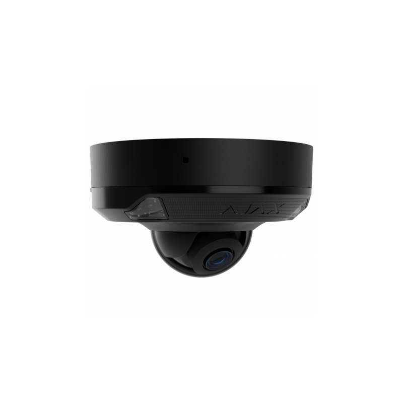 Cámara domo IP Ajax de 8 megapíxeles con lente de 4 mm, diseñada en color negro y protección IP65. Ofrece visión nocturna por infrarrojos y luz blanca de hasta 15 metros, integra micrófono para grabación de audio, y utiliza compresión H265+. Incorpora funciones de inteligencia artificial, WDR, compatible con PoE de 802.3at, y ranura para tarjeta MicroSD hasta 256GB. Soporta ONVIF para integración con otros sistemas, facilitando la instalación y conexión en redes de videovigilancia.