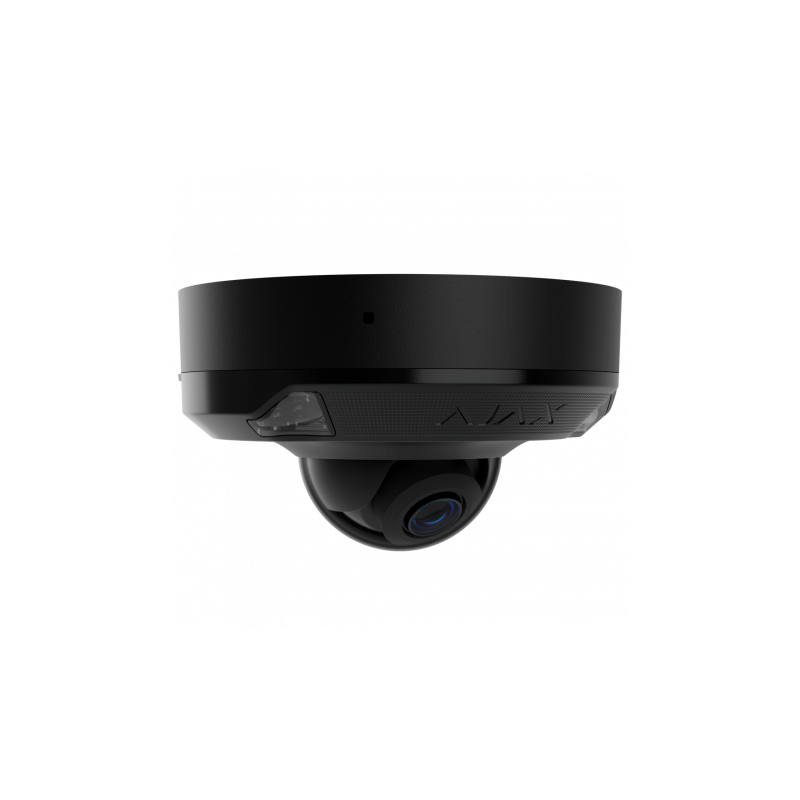Cámara domo IP Ajax de 5 megapíxeles, con sensor CMOS 1/2.8 pulgadas y lente de 4 mm. Ofrece protección IP65, visión nocturna con infrarrojos y luz blanca, hasta 15 metros de alcance, con micrófono integrado para audio. Soporta almacenamiento en tarjeta MicroSD de hasta 256 GB, compresión H.265+, tecnología WDR, funciones avanzadas de inteligencia artificial y conexión PoE compatible con IEEE802.3at. Es compatible con ONVIF para integración con otros sistemas y tiene acabado en color negro.