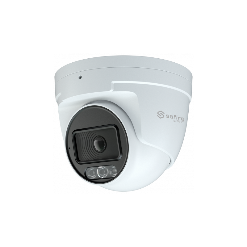 Cámara Turret IP Safire Smart, 8 MP, lente 2.8 mm, micrófono, luz blanca de 20 a 30 metros, detección humano y vehículo, IP67, PoE.